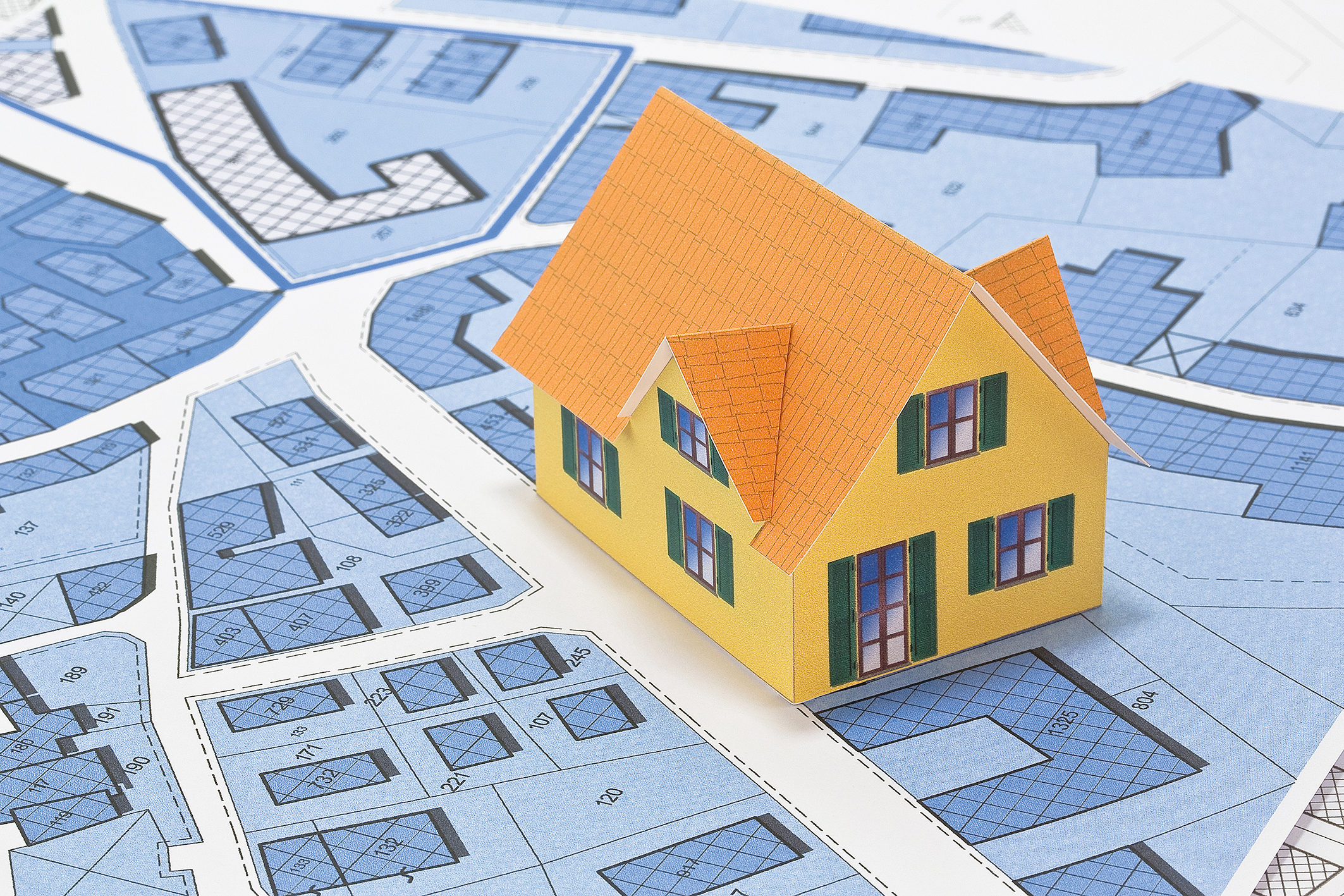 Cadastral map with buildings, building plot and free land parcel for house construction – building activity concept with cardboard house